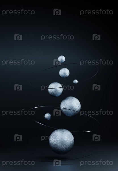 3D-рендеринг, металлические синие сферы плавают на темном фоне