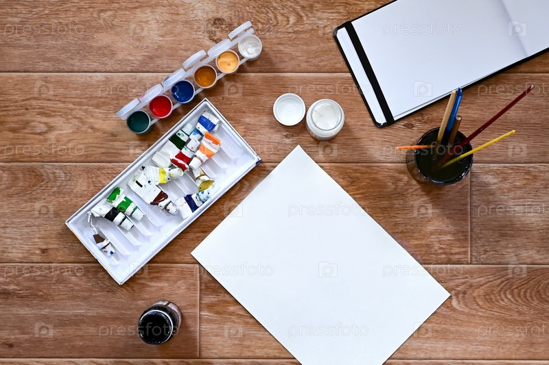 Набор гуаши и красок для рисования на белом листе. Понятие творчества и хобби