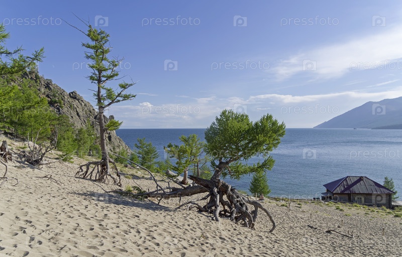 Памятник природы - ходульные деревья. Результат выветривания почвы. Бухта Песчаная, Большая Байкальская тропа. Озеро Байкал. Иркутская область, Россия. Август