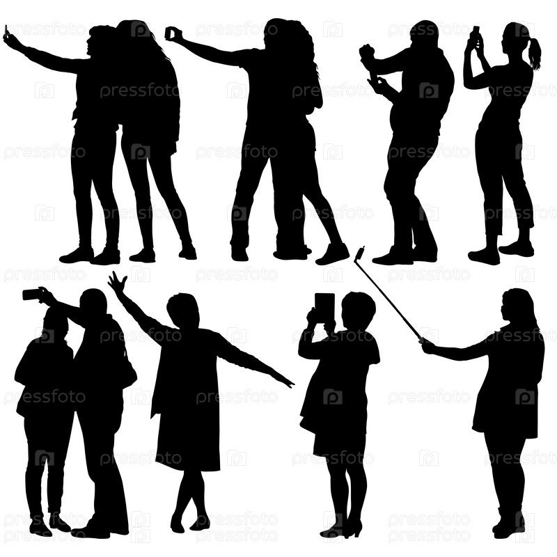 Установите силуэты мужчины и женщины, делающих селфи со смартфоном на белом фоне
