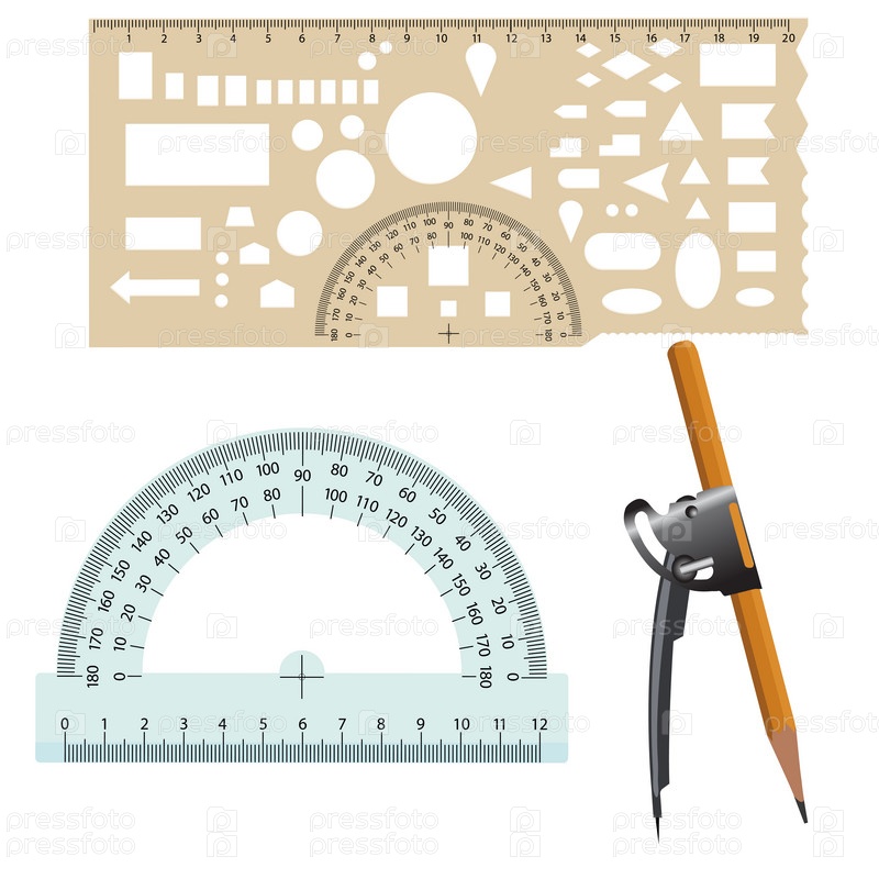 Линейка компасов и инструменты рисования транспортира на белом фоне