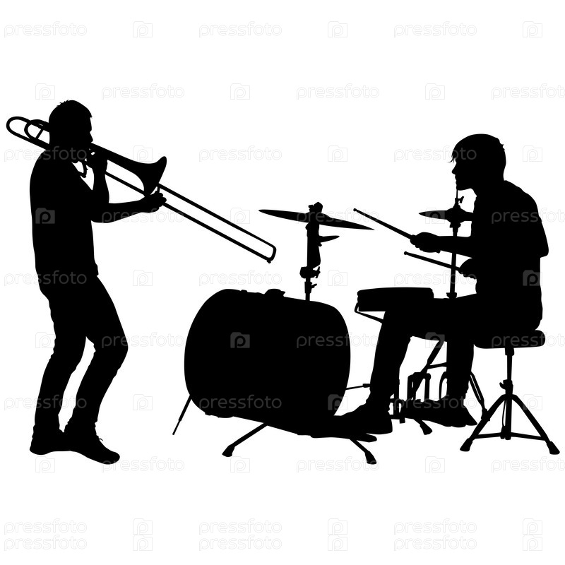 Силуэт музыканта, играющего на тромбоне и барабанщике на белом фоне