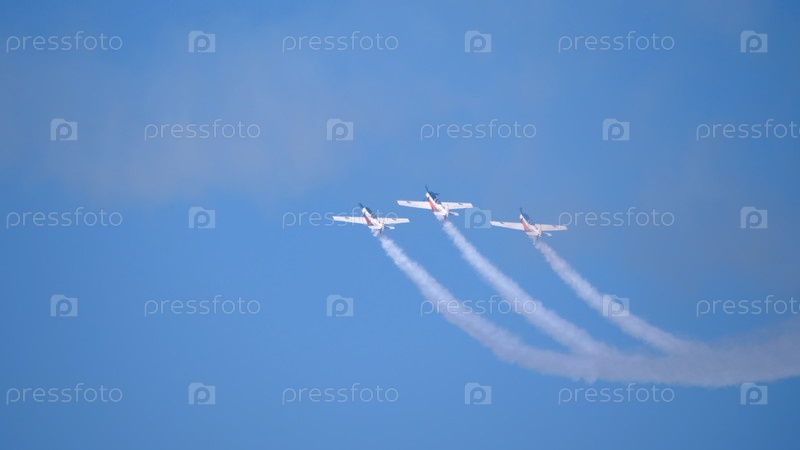 Москва Россия Аэродром Жуковский 31 августа 2019 года: выступление пилотажного самолета Як-52 на международном аэрокосмическом салоне МАКС-2019