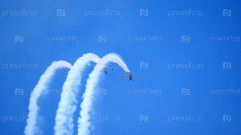 Москва, Россия, Аэродром Жуковский 31 августа 2019 года: выступление пилотажного самолета Як-52 на международном аэрокосмическом салоне МАКС-2019, Москва, Россия, Аэродром Жуковский 31 августа 2019 года: выступление пилотажа Як-52 на международном аэрокос