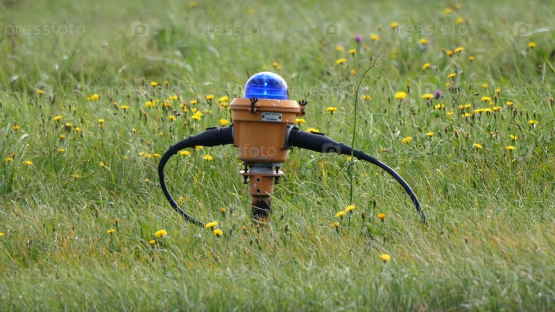 Синий фонарь на рулежной дорожке аэропорта, стоящий в траве, Синий фонарь на рулежной дорожке аэропорта, стоящий в траве