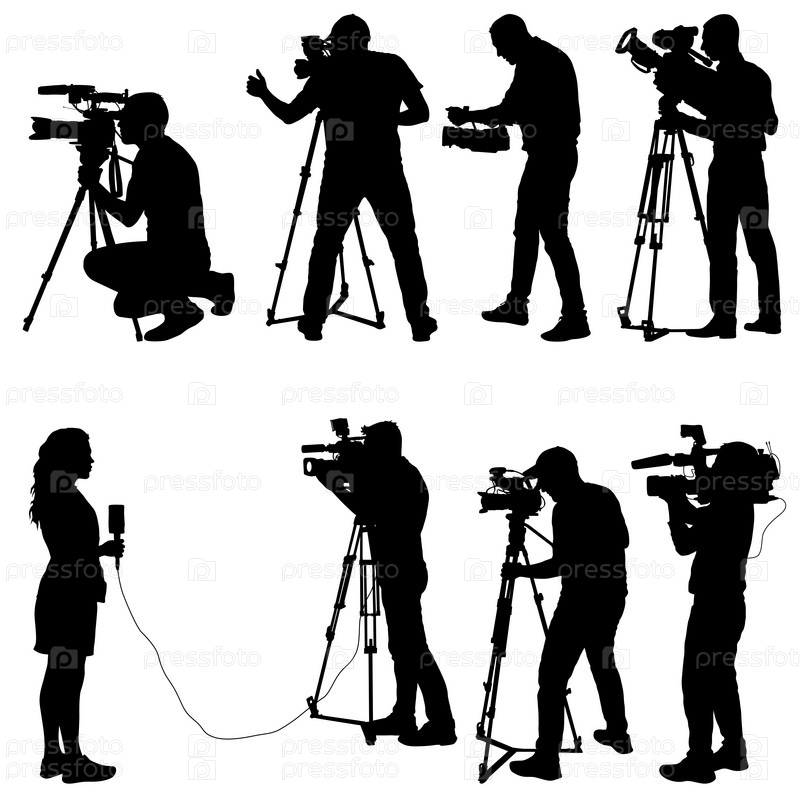 Установите оператора с видеокамерой. Силуэты на белом фоне