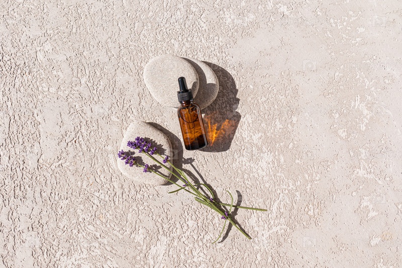 Косметическая бутылочка с пипеткой лежит на овальном сером камне с веточкой живой лаванды. Эко-натуральное средство по уходу за кожей. Макет косметического бренда