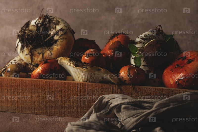 Разные виды свежих грибов сразу после сборки в коричневой коробке на коричневом фоне