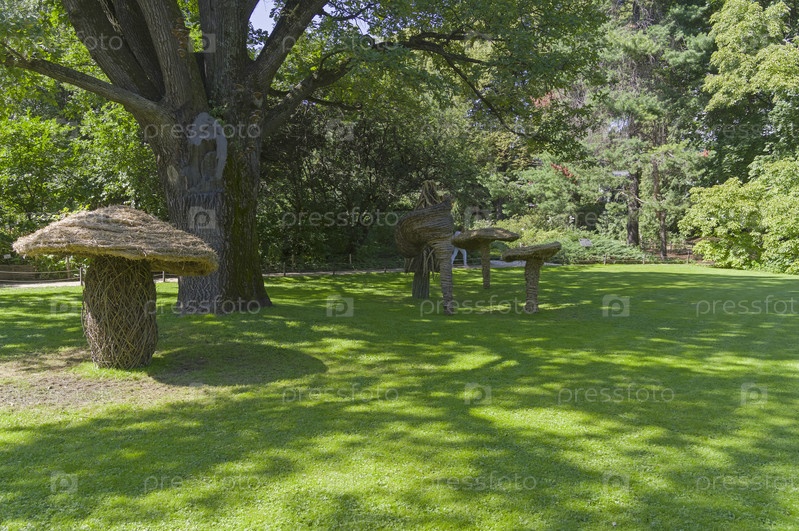 Забавные парковые скульптуры, сделанные из веток деревьев - огромные грибы. Аптекарский Огород (филиал ботанического сада МГУ). Москва. Солнечный день в августе