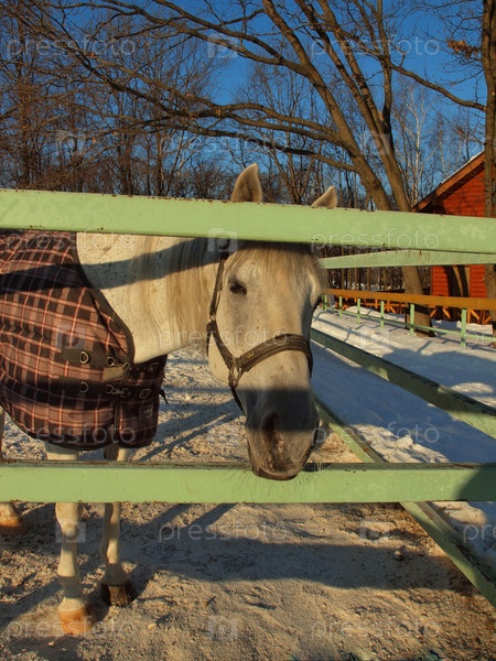 Лошадь в попоне в лучах зимнего солнца