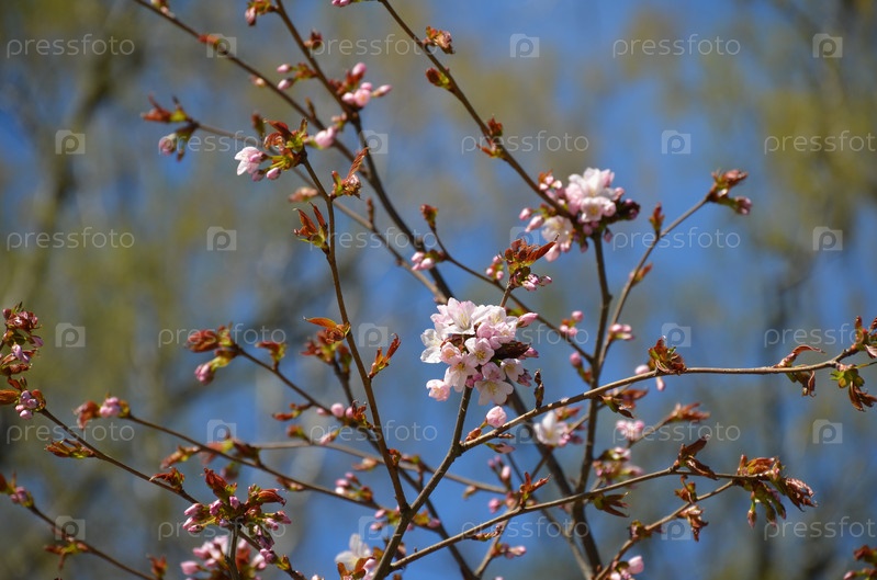 Зацветающая розовая вишня, сакура, на ветвях с распускающимися листьями