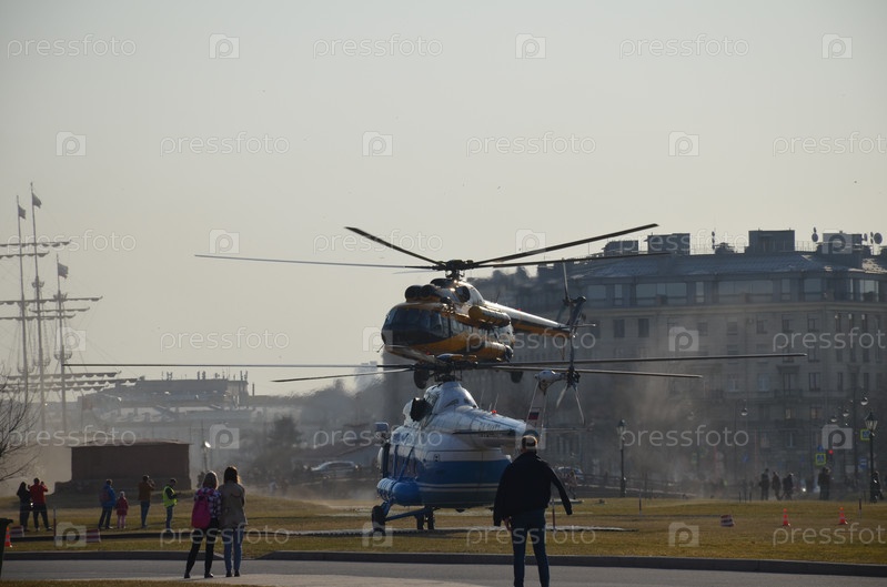 Люди наблюдают за посадкой прогулочного вертолета на площадку рядом с Петропавловской крепостью в Санкт-Петербурге
