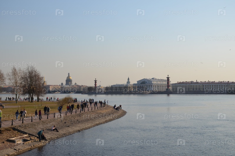 Вид на акваторию Невы в Санкт-Петербурге весной: стрелка Васильевского острова, Ростральные колонны, Исаакиевский собор, Адмиралтейство, Кунсткамера, стрелка Заячьего острова, Дворцовый мост, здание Биржи