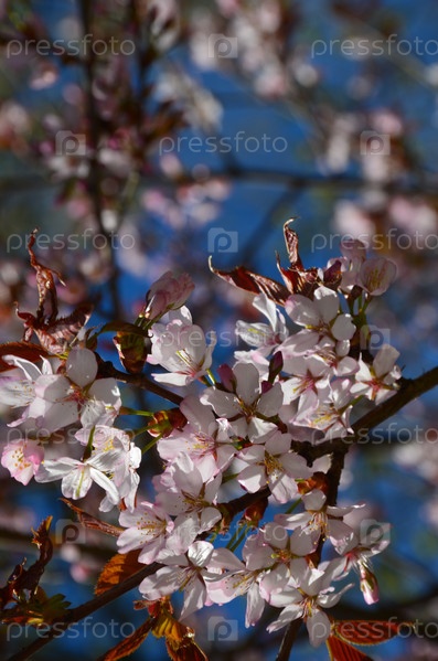 Розовые цветы сакуры, вишни на ветвях с распускающимися листьями весной на фоне голубого неба