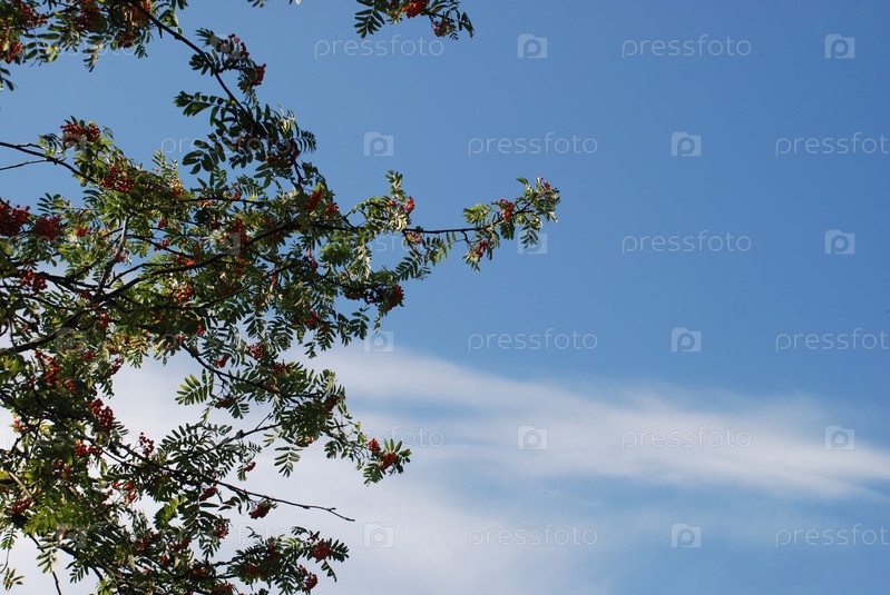 Ветви рябины с красными ягодами. На фоне голубого неба с маленькими белыми облаками несколько изогнутых ветвей рябины с зелеными листьями и красными плодами
