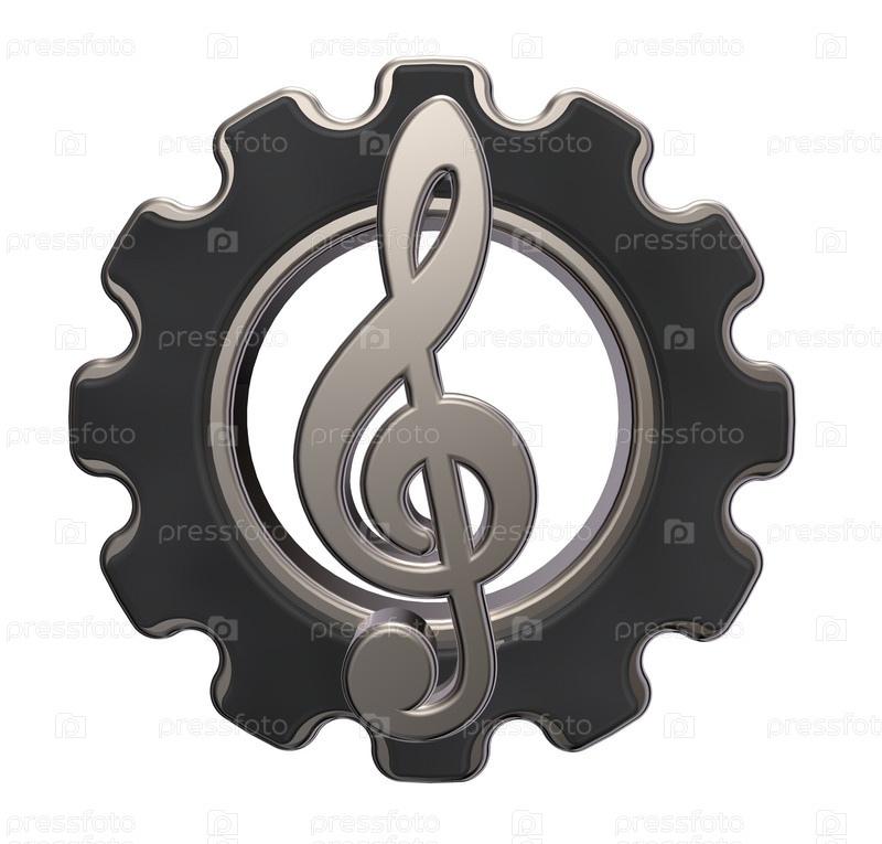 Зубное колесо и металлический скрипичный ключ на белом фоне - 3d иллюстрация