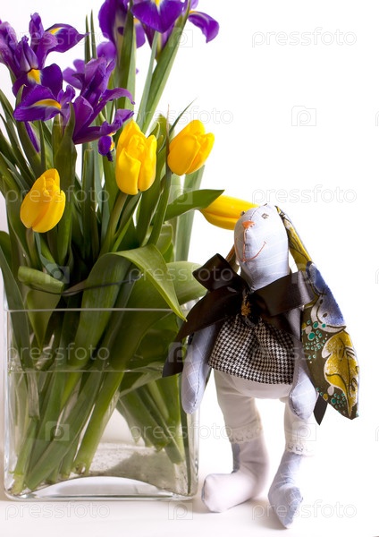 Кролик и букет из тюльпанов и ирисов