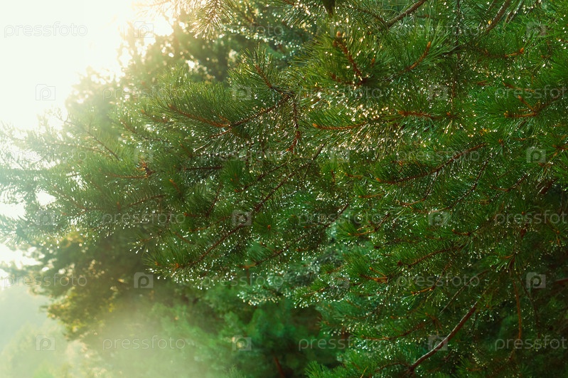 Капли дождя на еловых ветках, капли росы на еловых иголках в лесу
