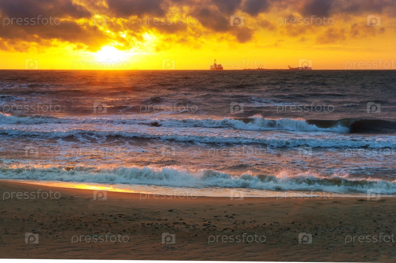 Закат на море, волны бьются о волнорез, море на рассвете, корабли на горизонте