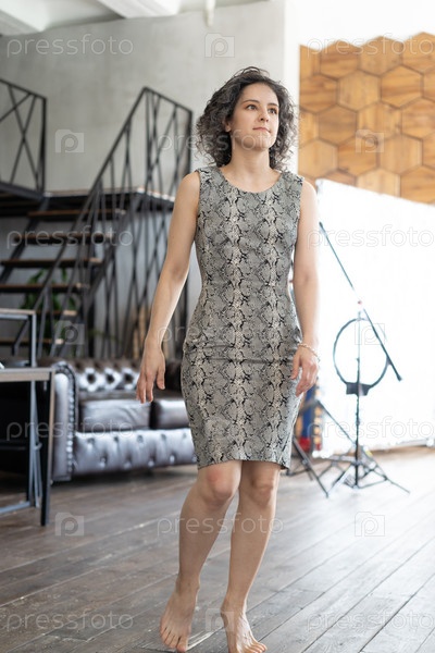 Молодая красивая женщина позирует в коротком платье в студии