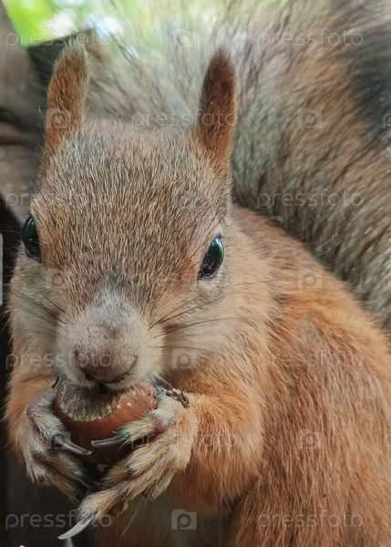 Белка-длинный коготь крупным планом схватила зубами лесной орех и мотрит прямо тебе в глаза