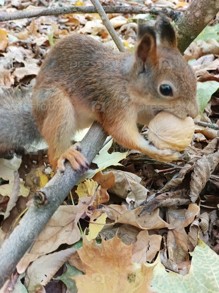 Бельчонок на ветке, схватив зубами грецкий большой орех в скорлупе