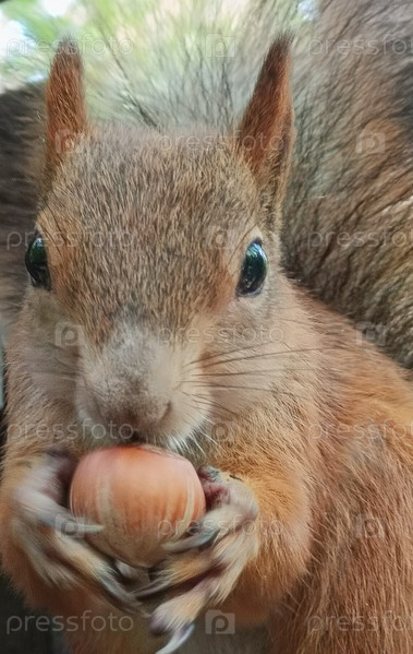Белка крупным планом смотрит на тебя, обхватив фундук лапками с длинными коготками