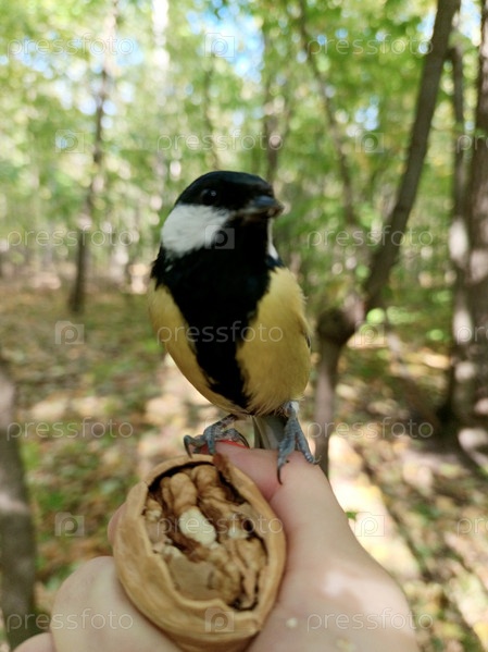 Синичка в профиль загадочно смотрит прямо тебе в глаза держась коготками за руку, желая поклевать орех
