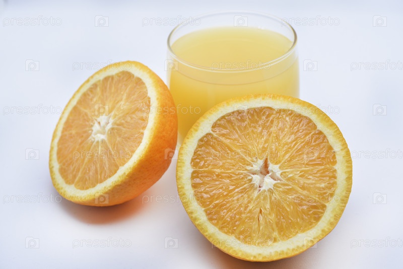 Апельсиновый сок в стеклянном стакане и плоды апельсинов. Освежающий напиток на белом фоне фруктов