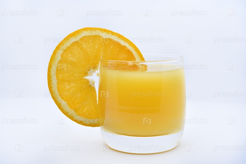 Апельсиновый сок в стеклянном стакане и плоды апельсинов. Освежающий напиток на белом фоне фруктов