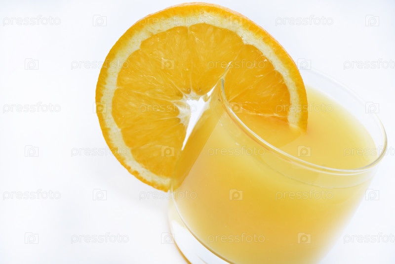 Апельсиновый сок в стеклянном стакане и плоды апельсинов. Освежающий напиток на белом фоне фруктов
