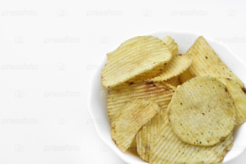 Желтые кусочки жареного картофеля в тарелке. Соленые чипсы на белом фоне