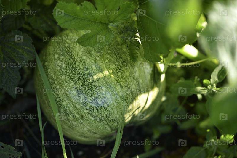 Зеленая тыква в саду. Плоды тыквы в лучах заходящего солнца летом. Овощи в саду