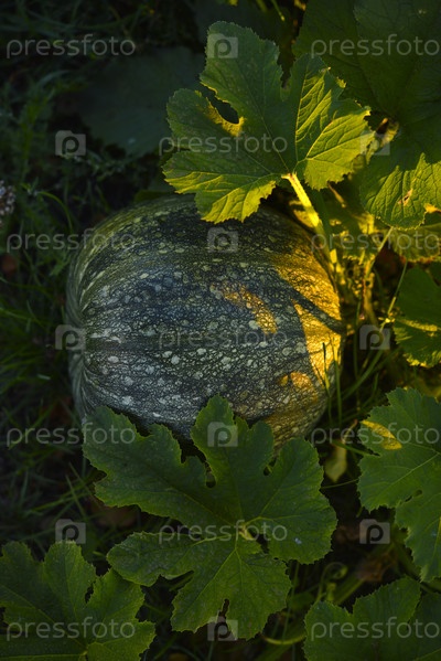 Зеленая тыква в саду. Плоды тыквы в лучах заходящего солнца летом. Овощи в саду