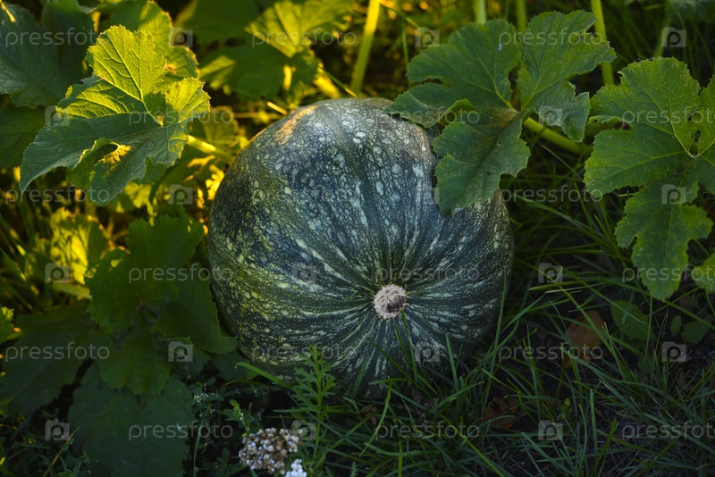 Зеленая тыква в саду. Плоды тыквы в лучах заходящего солнца летом. Овощи в саду