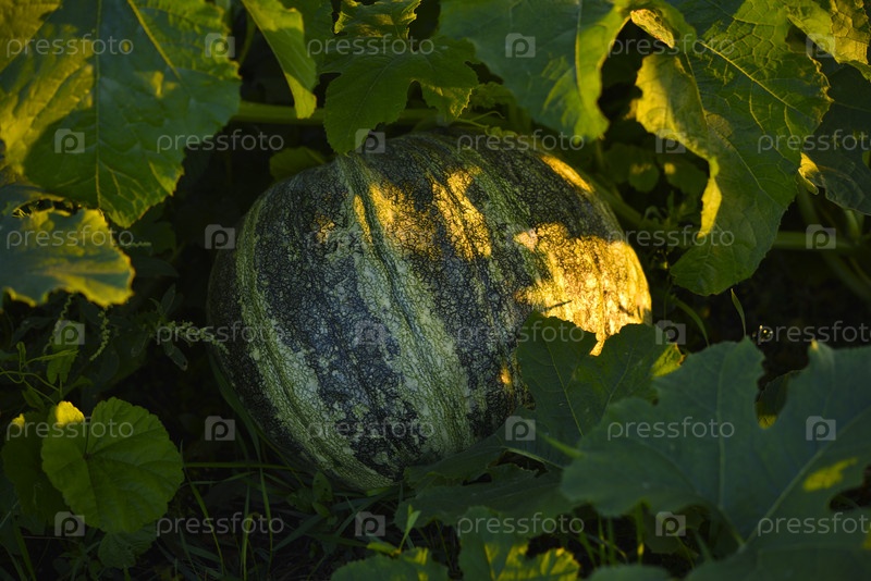 Зеленая тыква в саду. Плоды тыквы в лучах заходящего солнца летом. Овощи в саду
