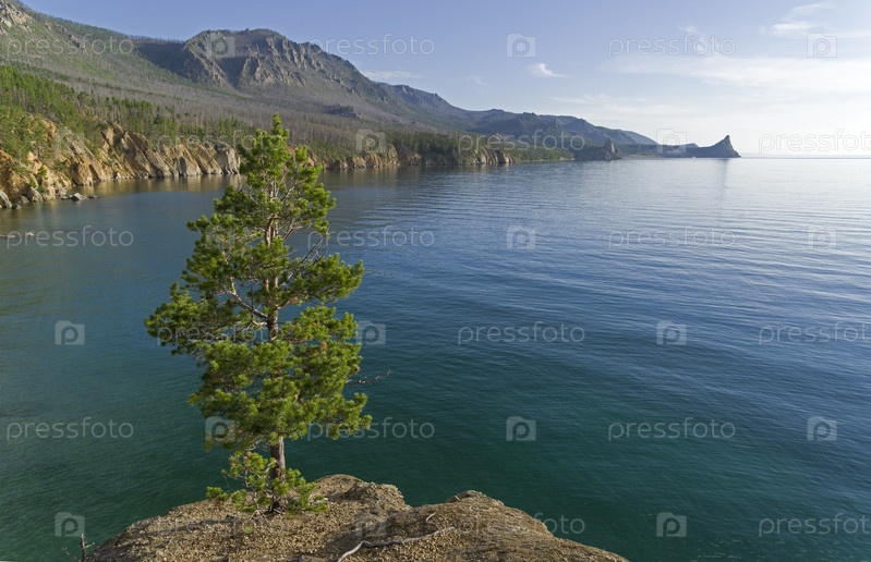 Маленькая сосна на высоком обрывистом берегу. Вид с Большой Байкальской тропы. Озеро Байкал. Иркутская область, Россия. Август