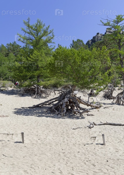Памятник природы - ходульные деревья. Результат выветривания почвы. Бухта Песчаная, Большая Байкальская тропа. Озеро Байкал. Иркутская область, Россия. Август