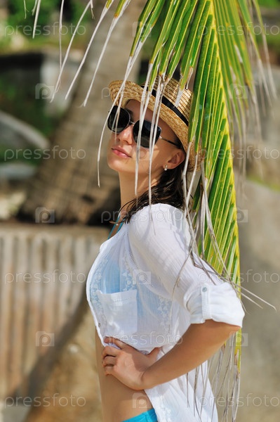 Женщина в солнцезащитных очках под пальмой