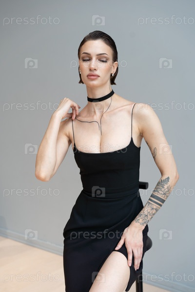 Молодая красивая женщина позирует в коротком платье в студии