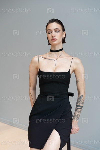 Молодая красивая женщина позирует в коротком платье в студии