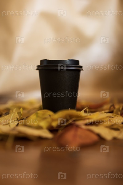 Кофейная чашка и осенние листья на деревянном фоне
