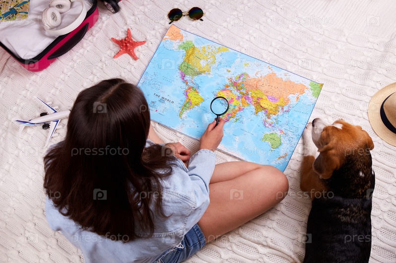 Девушка с собакой изучает политическую карту, планирует отпуск