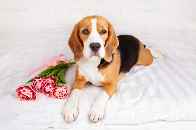 Собака породы бигль лежит на кровати с букетом тюльпанов