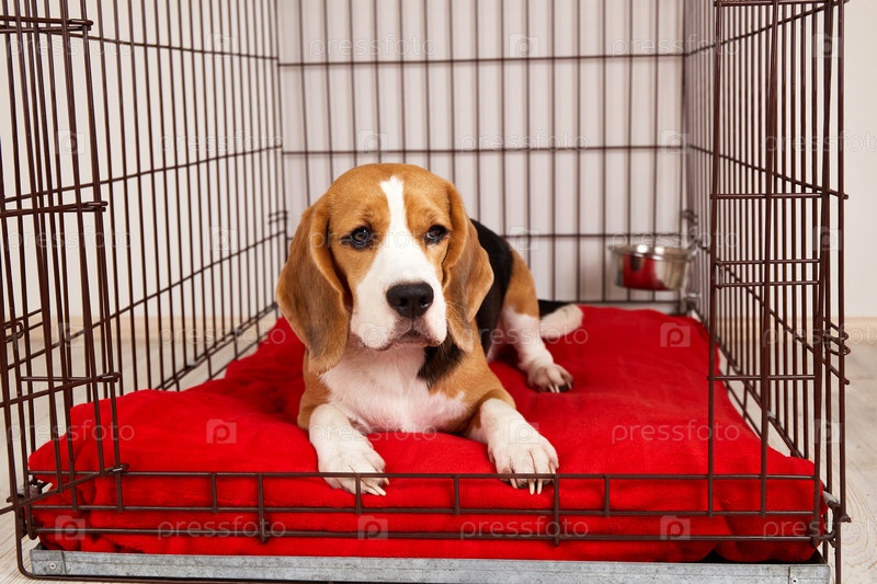 Собака бигль сидит в клетке