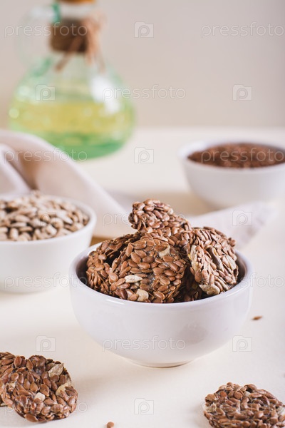 Хрустящий хлеб из льна и семян подсолнечника в миске на столе, вертикальный вид