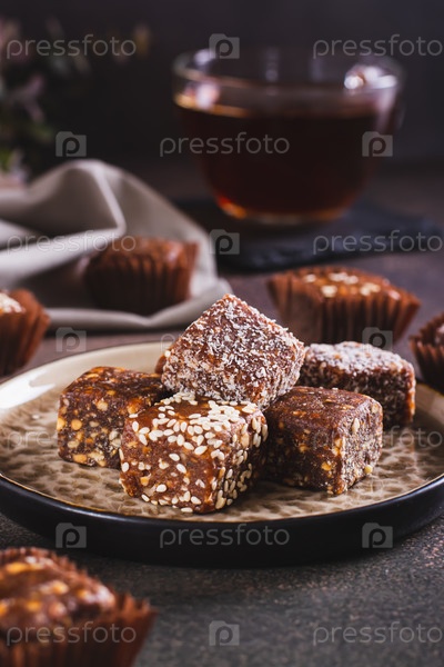 Полезные конфеты из инжира, фиников, орехов, кокоса и семян кунжута на вертикальной тарелке