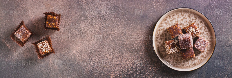 Конфеты без сахара из фруктовой пасты, орехов и семян кунжута на тарелке, вид сверху, веб-баннер
