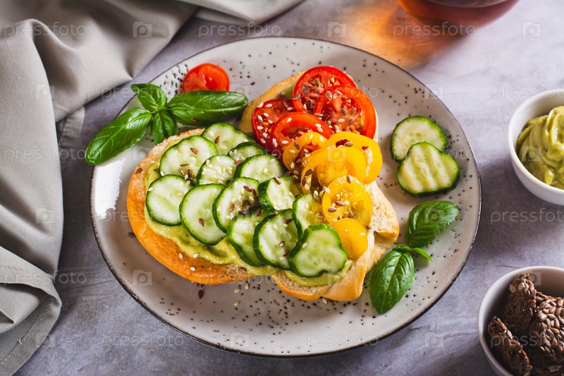 Сердце брускетты с гуакомоле, помидорами и огурцом на тарелке