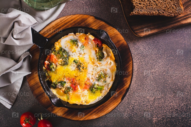 Сковорода с яичницей с брокколи и помидорами на деревянной доске, вид сверху